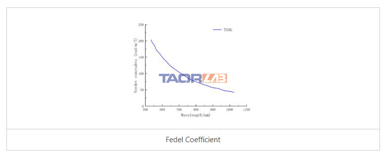 TSAG ファラデー結晶は 400 ~ 1600 nm の波長範囲で使用されます。TGG よりもベルデ定数が大きく (TGG より 20% 高く)、吸収係数が低い (TGG より 30% 低い) ため、小型の磁気光学デバイスに最適です。